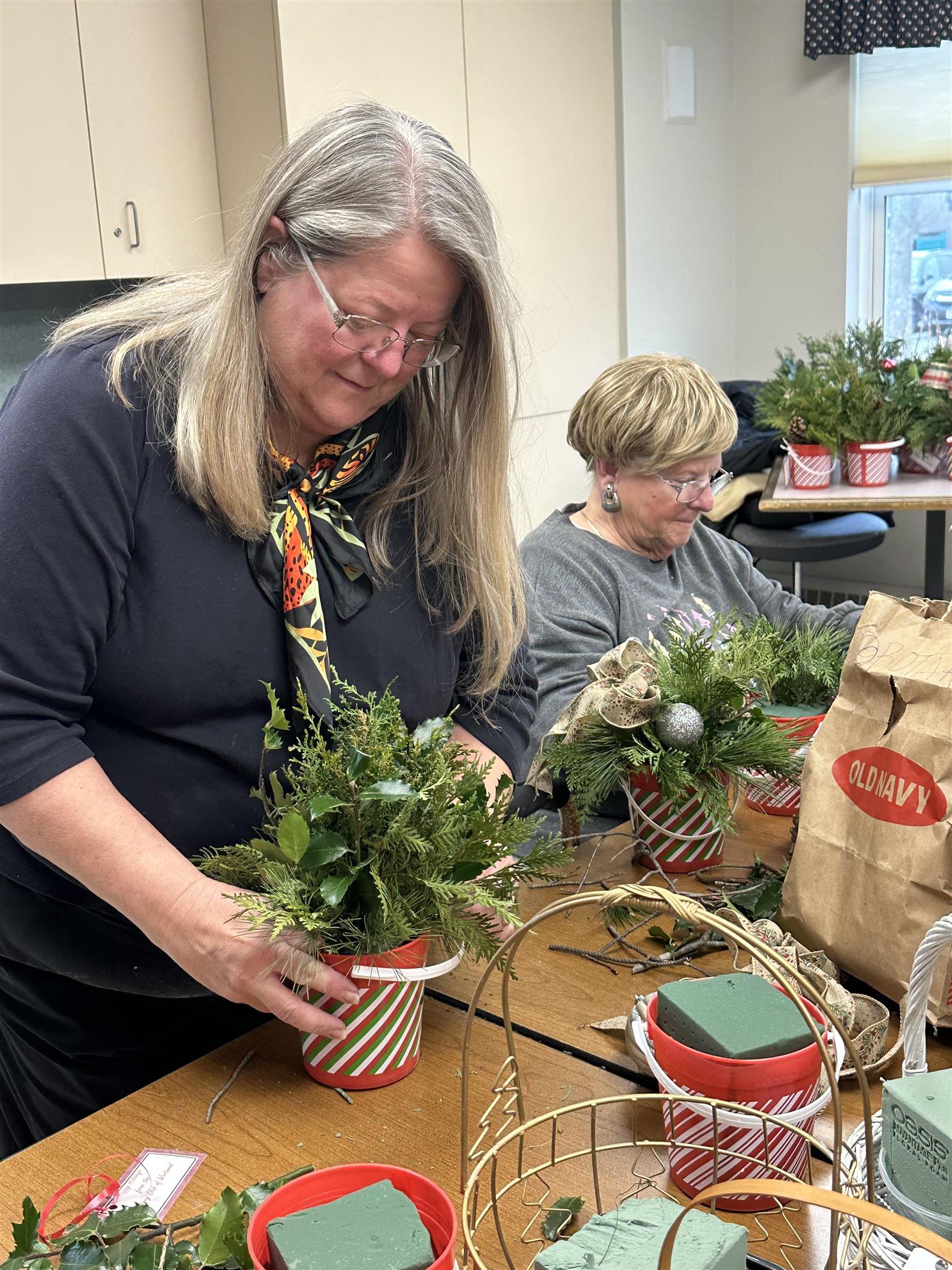 The Rotary Club of Westwood gets together every year (for about the last 10 years or more) to create holiday baskets for the seniors who are unable to get out. We collaborate with the Westwood Senior Center who distributes holiday meals to about 30 shut ins and takes a basket to each of them. We have always received many compliments and how much the seniors enjoy them. There are about 10 rotary members which participate in this production. We get together at the Senior Center (they let us use one of their rooms) on a Saturday morning for 2 hours. Many of use this opportunity to trim our evergreen and holly bushes for the material to be placed in the baskets. This year, we switched to little buckets that were already red and green decorated and could hold the water a little better. We completed about 35 that will be distributed. Much fun was had with the group together and music in the back ground.