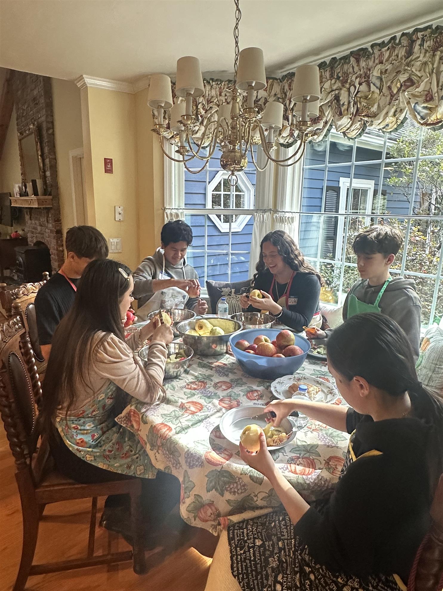 After apple picking, everyone gathered at the home of Rotarian Jeanne Reimonn (Milford Rotary) for lunch and to peel and assemble their pies. Each student was able to bring home a pie for their host family. Every month the D7910 Youth Exchange Committee arranges an activity for the exchange students. Next month, the students have plans to attend a Harvard hockey game.