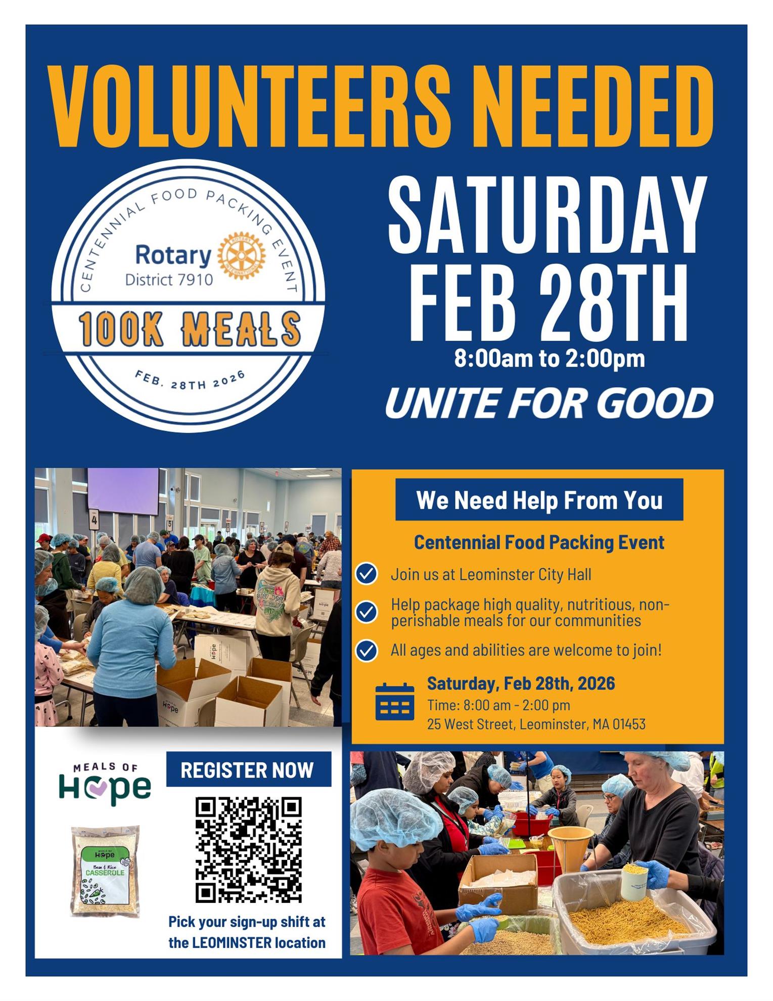 On Saturday, February 28, 2026, we will partner with Meals of Hope to pack 100,000 nutritious meals—all in one day, across two locations—to help address food insecurity throughout our region.