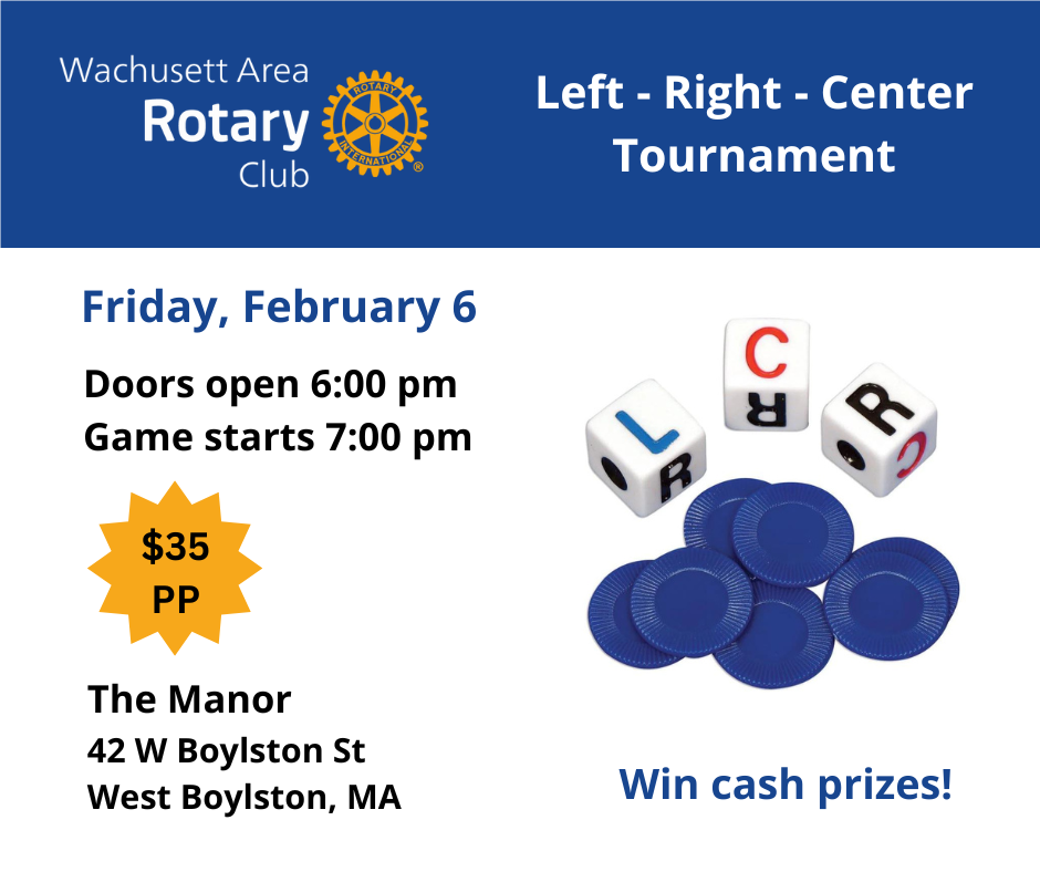 Join the Wachusett Area Rotary Club on Friday, February 6, 2026 for a fun evening playing Left-Right-Center! The game is easy to learn and easy to play - no experience necessary. Win cash prizes! There will also be a 50/50 raffle for more opportunities to win cash prizes.