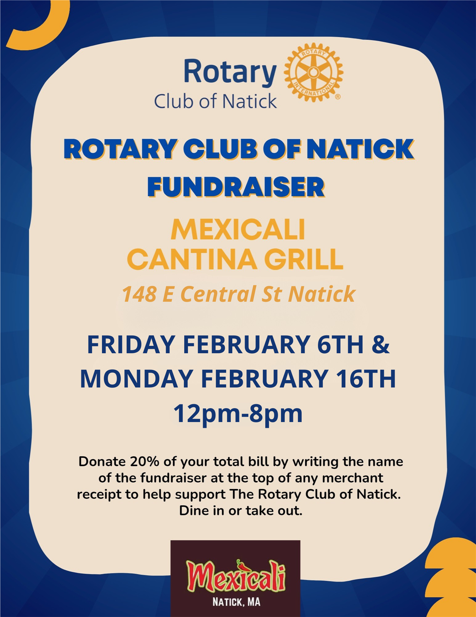 Natick Rotary’s Mexican Night is back! Join us for a Dine Out to Donate fundraiser at Mexicali Restaurant on Friday, February 6 or Monday, February 16. On either date, 20% of your food bill will be donated to the Rotary Club of Natick to support our local service projects. Enjoy great Mexican food while making a meaningful difference in our community.