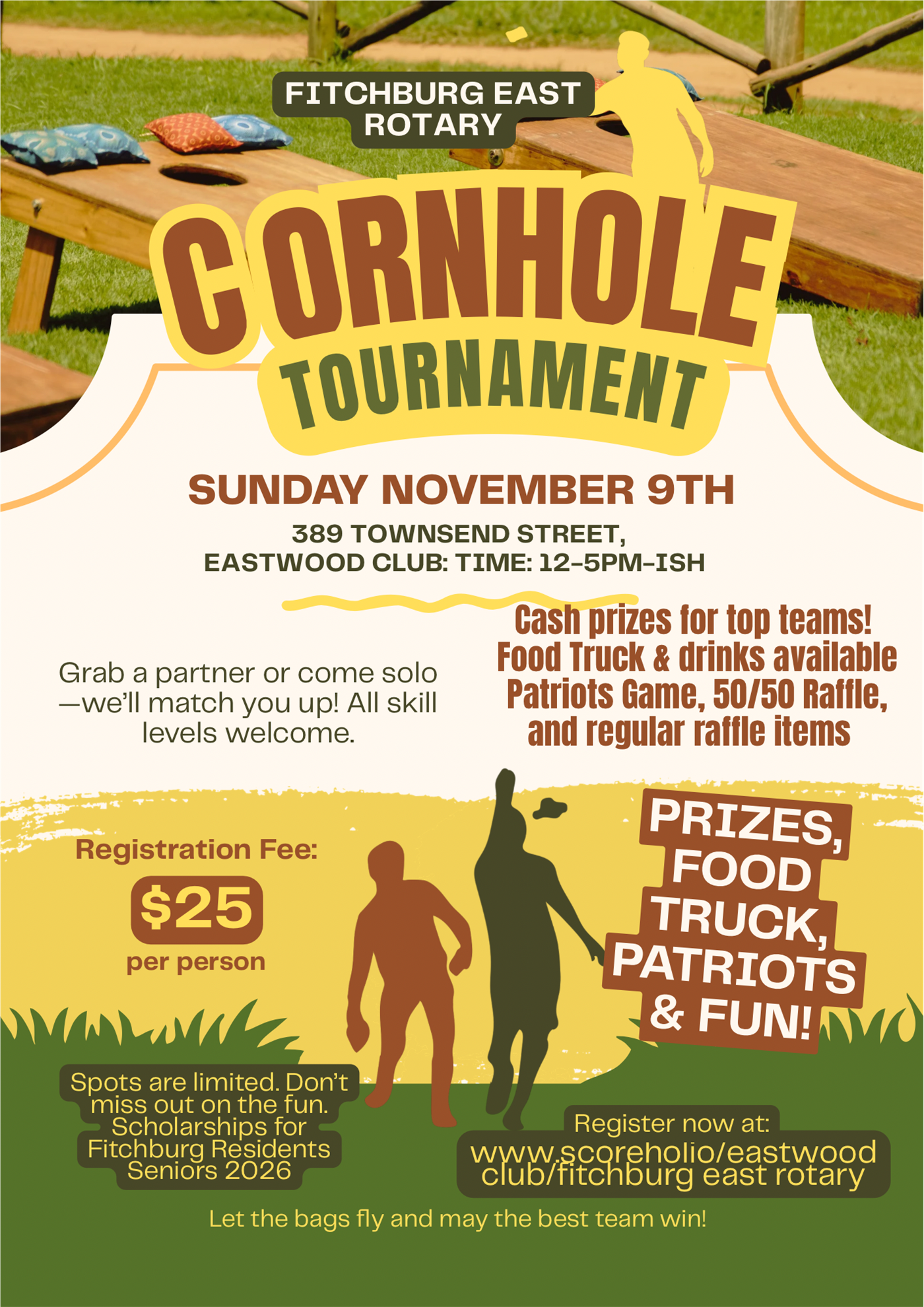 We are hosting a cornhole tournament at Eastwood Club, to raising money for our scholarship for Fitchburg resident seniors for class of 2026. We are hosting our event on November 9, 2025 we are going to have a food truck on site, bucket of beers to purchase, raffles and 50/50 raffles. Let the bags fly and come and have some fun and support a great cause. Register online at https://www.scoreholio.com/eastwoodclub/fitchburgeastrotary