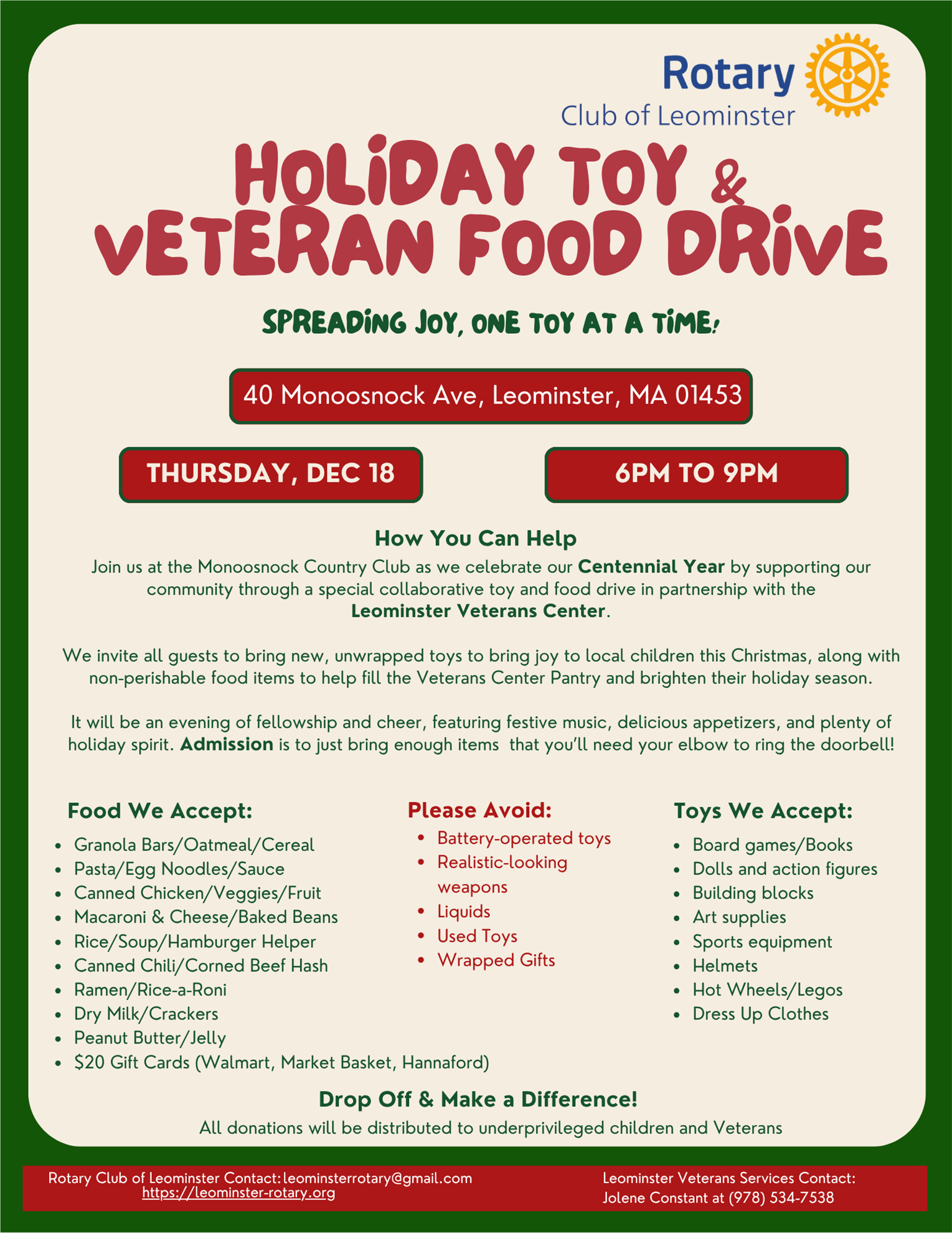 Join us at the Monoosnock Country Club as continue our Centennial Year celebration by supporting our community through a special collaborative toy and food drive in partnership with the Leominster Veterans Center.